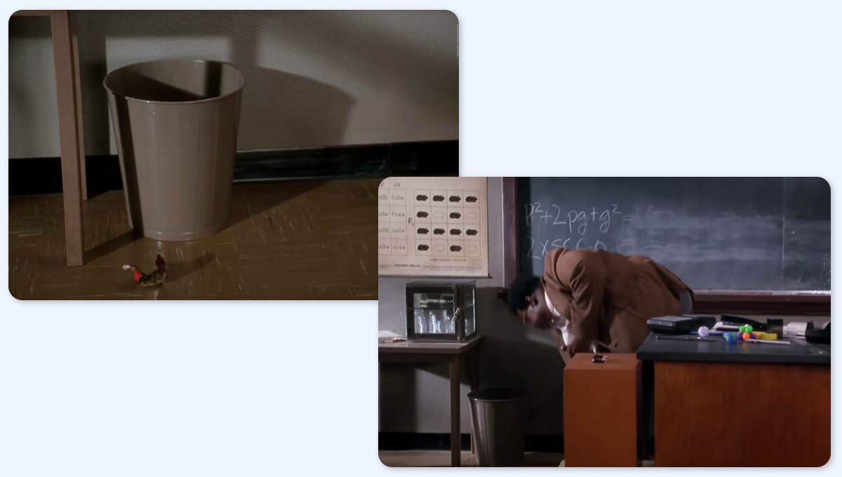 После лекции профессор Шерман Кламп открывает плитку шоколада и выбрасывает фантик в мусорное ведро. Фантик падает рядом с ведром, но когда профессор наклоняется, чтобы поднять фантик, он оказывается в десятках сантиметров от корзины и вправо.