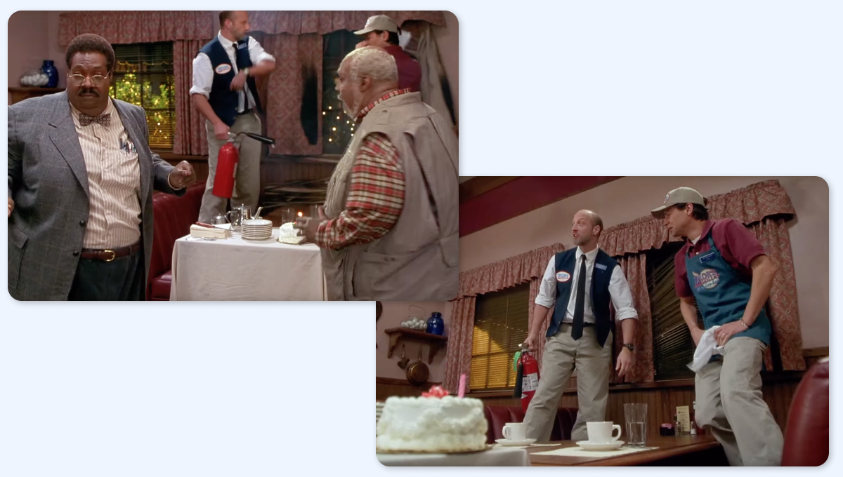 Семья Кламп и Дениз празднуют выход на пенсию отца Шермана в ресторане. Отец подавился куском мяса и случайно поджег шторы на окнах. После того, как сотрудники их потушили, на краю шторы отчетливо видно обгоревшее пятно. Но в следующем кадре шторы как новые. (17:25– 17:28)