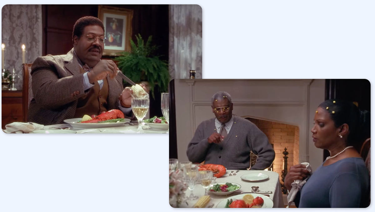 При съемке знаменитой сцены семейного ужина Клампов Эдди Мерфи по очереди играл роли каждого члена семьи. Чтобы диалоги оставались живыми, во время съемок ему давали записи реплик других персонажей, и он импровизировал в ответ.