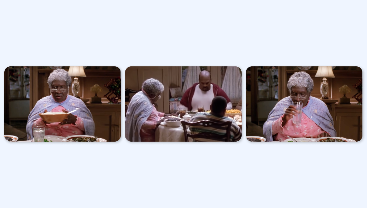 Во время первого ужина семьи Кламп, когда бабушка начинает кашлять, крупным планом виден перед ней стакан воды. Затем камера переключается на другой ракурс, и перед бабушкой появляется стакан колы. Дочь говорит: «Мама, выпей водички», а в следующем кадре кола снова превращается в воду.