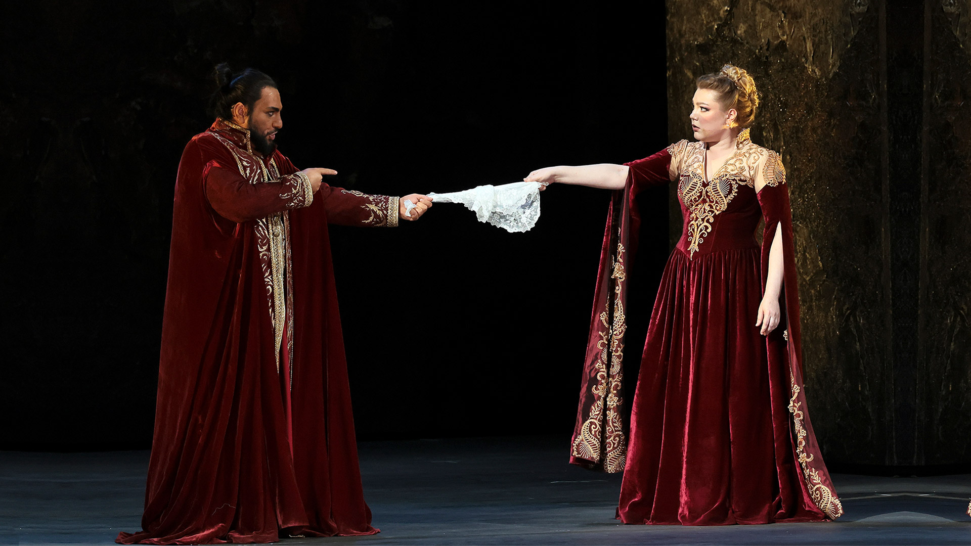 Художник по костюмам Габриэла Салаверри и художник-постановщик Антонио Ромеро создали на сцене Исторического театра вымышленный мир с реалистичными мотивами. Как и в украшениях, в костюмах заметны отсылки к восточной моде, но они также кодируют характерные черты своих владельцев. Например, это летящие, воздушные ткани платьев Дездемоны, богатый узор кафтанов Отелло, демонстрирующий его статус, или жесткие, лаконичные линии одежды Яго, раскрывающие его коварный, несговорчивый характер.