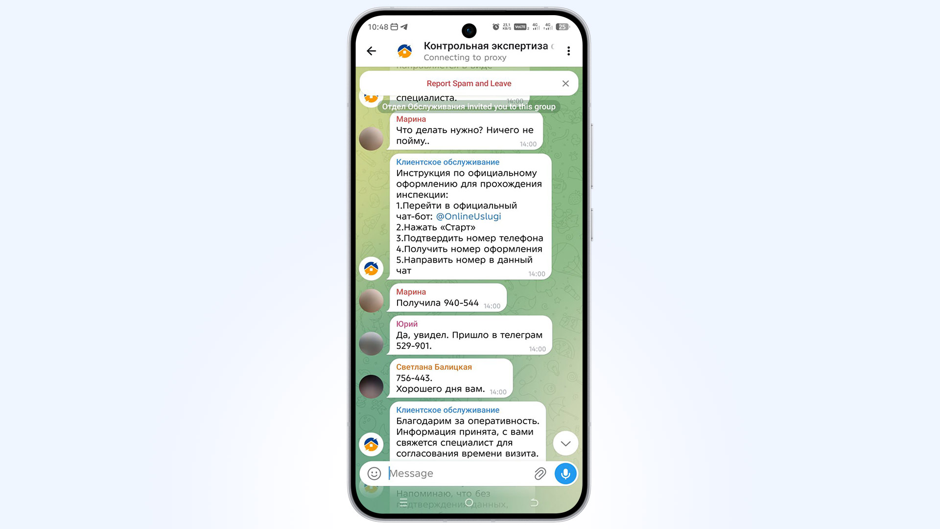 Так, участница чата по имени Марина спросила: "Что делать? Я ничего не понимаю". Далее появилось сообщение от имени «Службы поддержки» с пошаговым алгоритмом действий: зайти к боту, нажать «Старт», подтвердить номер телефона и отправить полученный код в чат. Мошенники построили диалог так, чтобы он выглядел как живая переписка со службой поддержки.