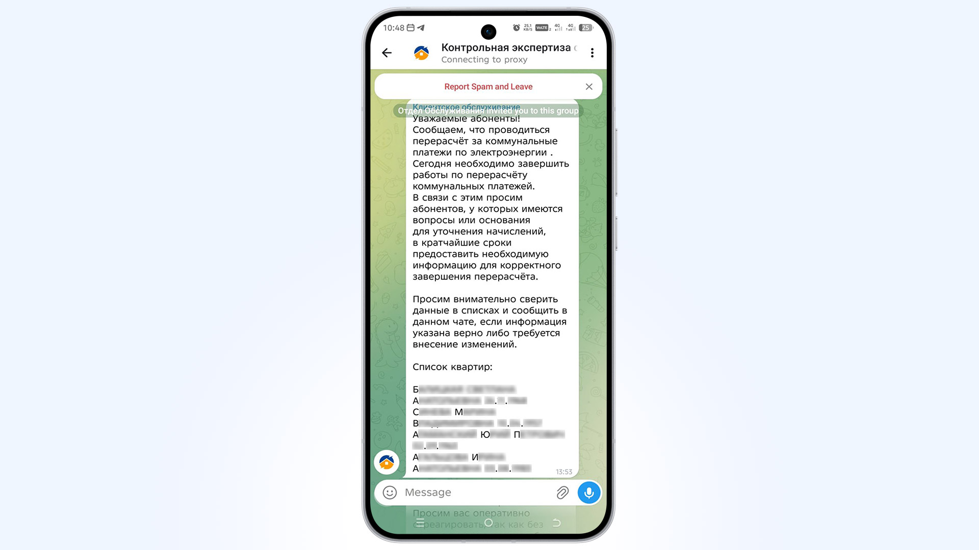 Напоминаем, что ни одна юридическая организация в сфере ЖКХ не требует переходить на сторонних чат-ботов, не запрашивает коды проверки и не публикует в открытых мессенджерах списки жильцов с полными датами рождения. При возникновении малейших сомнений в достоверности полученной информации Вам следует немедленно прекратить общение и самостоятельно обратиться в свою управляющую организацию или расчетный центр по номеру телефона, указанному в официальной квитанции.