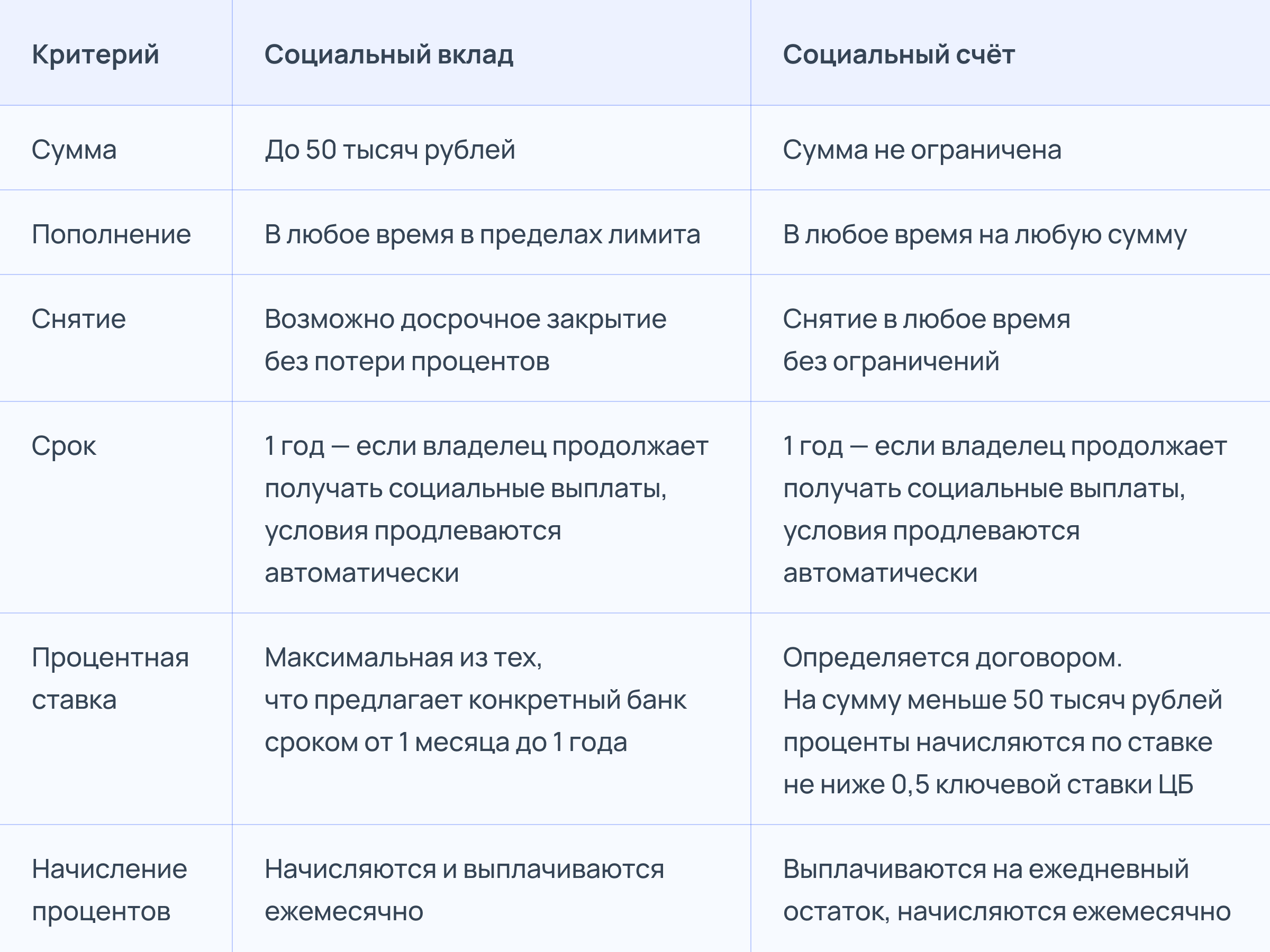 Социальный вклад имеет лимит пополнения – максимум 50 тысяч рублей. Ставка по немусоответствует максимальной ставке по регулярным депозитам сроком до года в конкретном банке(без учета акционных предложений).